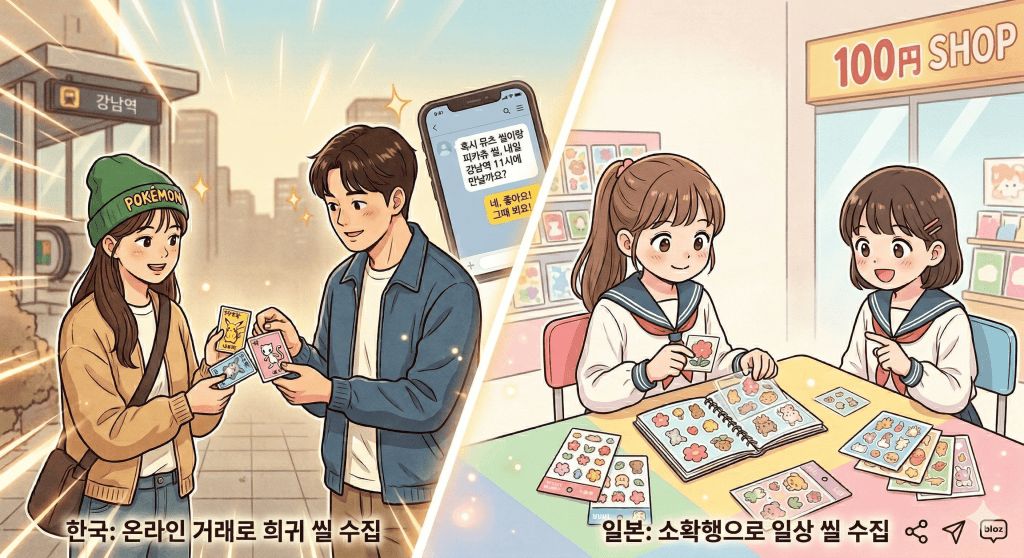 한국은 한동안 포켓몬 띠부씰이 보여줬듯, 어릴 적 향수를 간직한 키덜트들이 주도해서 폭발적인 전국적 유행을 만들어내는 에너지가 대단했습니다. 당근마켓에서 모르는 사람과 만나 씰을 바꾸는 모습은 한국 특유의 역동적인 공유 문화를 잘 보여주죠.