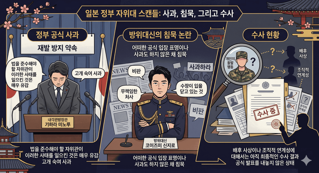 - 정부 공식 사과: 이번 사건에 대해 정부를 대표해 고개를 숙인 인물은 기하라 미노루 내각관방장관입니다. 기하라 장관은 “법을 준수해야 할 자위관이 이러한 사태를 일으킨 것은 매우 유감”이라며 공식 사과와 함께 재발 방지를 약속했습니다.
